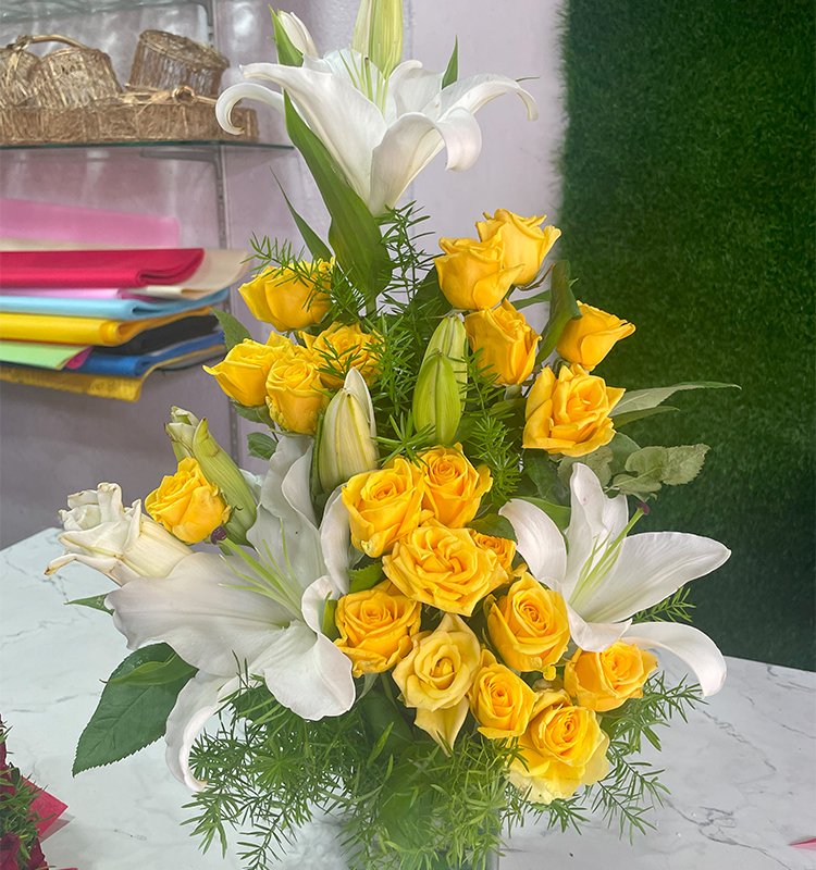 The yellow roses, symbolizing friendship and joy, pair perfectly with the elegant lilies, representing purity and grace. This cheerful bouquet is perfect for brightening someone’s day, celebrating special occasions, or simply expressing heartfelt sentiments.