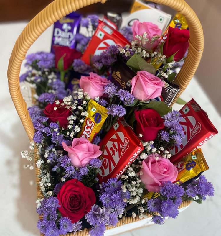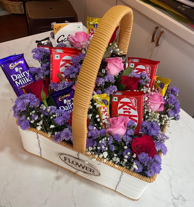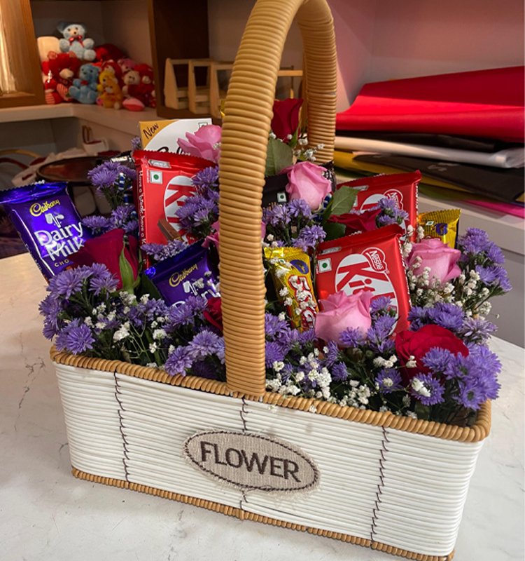 Surprise your loved ones with a delightful combination of sweetness and elegance. This handcrafted basket features an exquisite arrangement of fresh roses, lavender daisies, and baby’s breath, beautifully paired with an irresistible selection of premium chocolates including KitKat, Dairy Milk, Bournville, 5 Star, and Galaxy. Perfect for birthdays, anniversaries, or any occasion that calls for a heartfelt gesture. Presented in a rustic wicker basket labeled “Flowers”, this thoughtful gift promises to bring smiles and create memories.