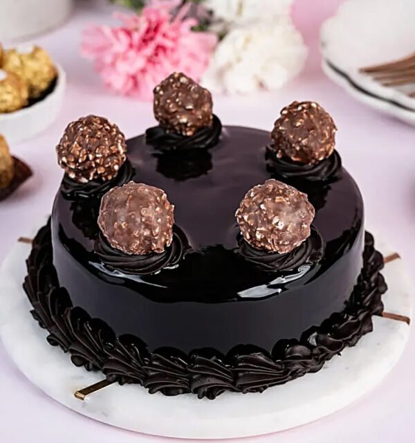 Treat yourself to the ultimate indulgence with our Ferrero Rocher Truffle Cake! Each slice is a decadent delight, featuring layers of moist chocolate sponge cake, rich chocolate ganache, and luscious Ferrero Rocher truffle filling. Topped with a creamy Nutella frosting and adorned with Ferrero Rocher chocolates, every bite is a luxurious experience of chocolatey bliss.