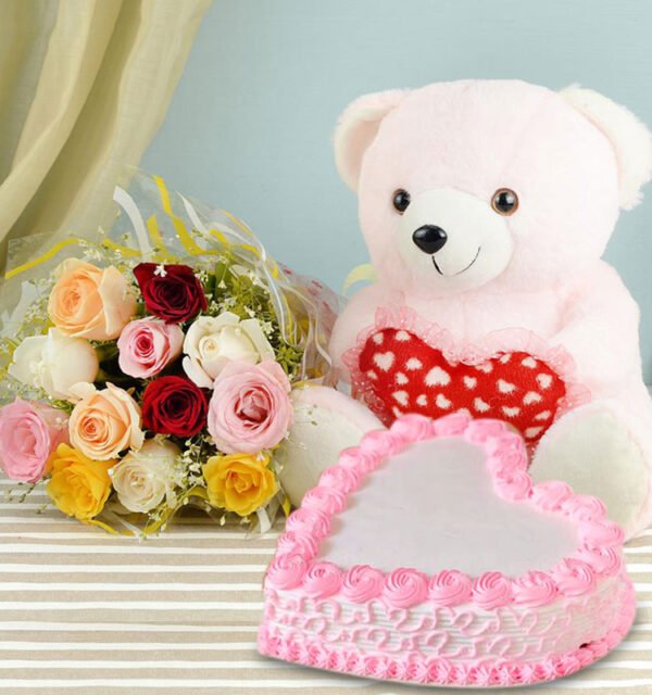 Indulge your loved one with this romantic and heartwarming gift combo. Featuring a heart-shaped cake adorned with delicate pink frosting and a cuddly pink teddy bear holding a heart-shaped pillow, this gift is perfect for expressing your deep affection.