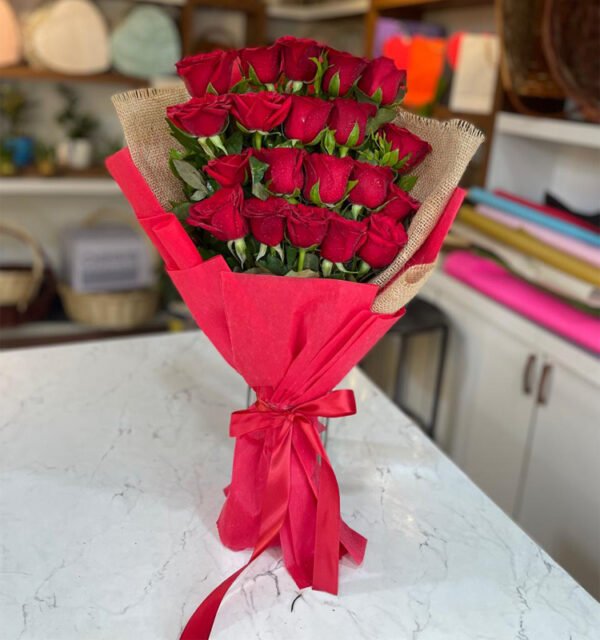 Say it with roses! This Classic Red Rose Bouquet features two stunning rows of fresh red roses, beautifully wrapped in red paper and jute, tied with a satin ribbon for the perfect finishing touch.