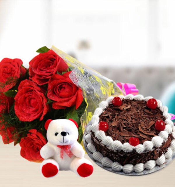 Indulge your loved one with this romantic and heartwarming gift combo. Featuring a bouquet of vibrant red roses, a cuddly teddy bear, and a delicious black forest cake, this gift is perfect for expressing your deep affection and creating a memorable occasion.