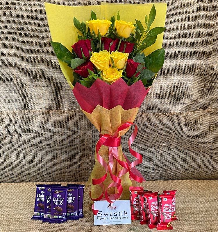 Red & Yellow Roses Bouquet with Dairy Milk N KitKat