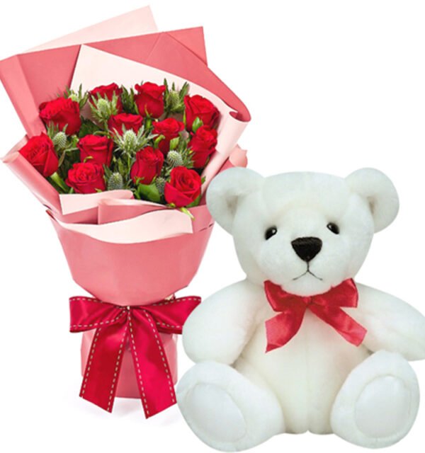 Express your love with this heartwarming gift combo. Featuring a bouquet of 10 vibrant red roses and a cuddly white teddy bear, this arrangement is perfect for birthdays, anniversaries, or any special occasion. The soft, plush teddy bear and the classic beauty of red roses create a truly romantic gift.