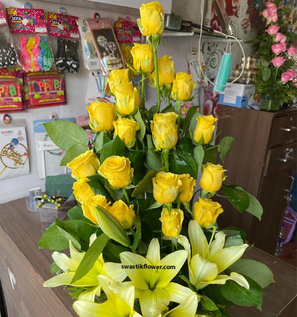 Sunshine Yellow Roses & Yellow Lilly's In Vase Arrangement