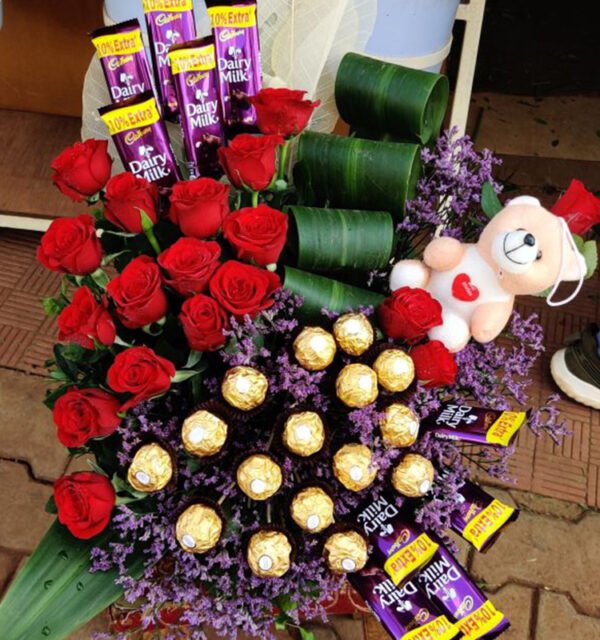 A charming teddy bear nestled amidst a cascade of red roses and Ferrero Rocher chocolates creates a heartwarming and visually appealing gift. This unique creation is perfect for expressing affection, celebrating special occasions, or simply brightening someone’s day with a sweet surprise.